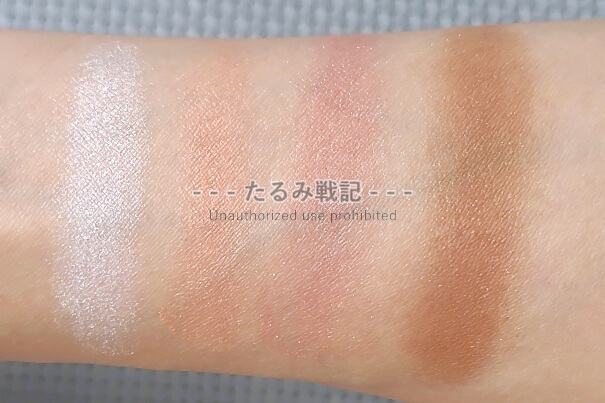 右上Bと左下C、そして右下Dもイエベ春っぽさを感じて楽しみでしたが、果たして左上Aは・・・?とは思いつつのスウォッチです。公式の説明では「まぶたに春めきを与えるピンク&オレンジに、アクセントとなる透明ペールカラーで今どきのクリアな印象に。なじみブラウンで陰影もアップ。」とあります。