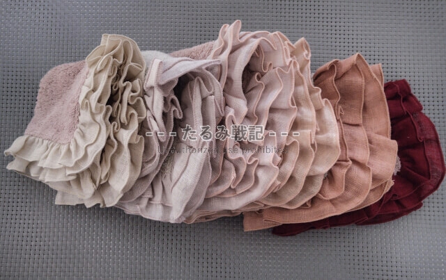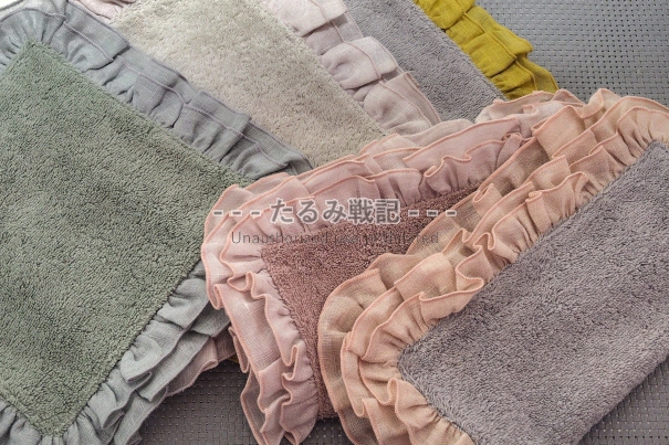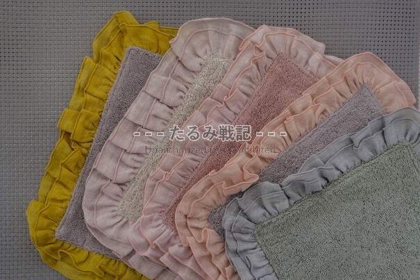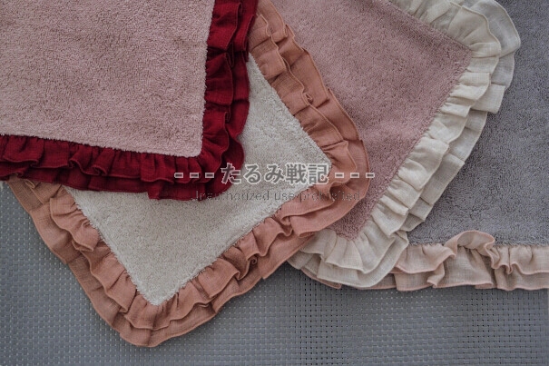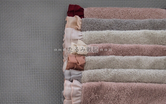 以前から伊勢丹のサイトでフリルがついたハンドタオルを見かけていて、素敵だなと思っていたものの、サイズが大きいので躊躇していました。ところが、ちょい小さめサイズがアパレル系ブランなどで別注されているのを知り、今だ!とばかりに買い込んでしまいました。