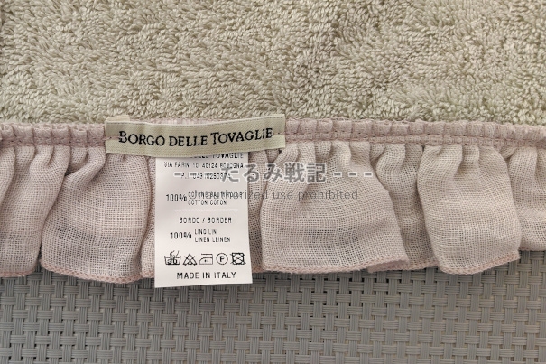 ふつーーーーにパイルがしっかりあるタオルなんです。よって、トイレで手を洗ってごしごし拭くのにぴったり。私が持っているのはボルゴ デレ トヴァーリの中では小さめサイズとはいえ、フェイラーや近沢レースよりは大きいので、家の洗面所にかけてあるタオルでごしごし拭くのとあまりかわらない感覚で拭けます。説明が難しいのですが、フェイラーや近沢レースは面積が小さい分、手をふくときに面積の活用を意識しながら動きを制限されるようなイメージで拭きますよね。ボルゴ デレ トヴァーリはその感覚が格段に少なくなります。