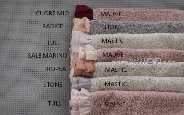 手持ちのボルゴデレトヴァーリをお見せします。例によってピンク中心なのはお許しを。某アパレルブランド別注のフリルがチェック柄のものなど、ほかにも若干あるのですが、フェイラーや近沢レースのときほど買いあさっていないので、コレクションとしてはささやかです。なお、「STONE」などは販売時の正式な色名ですが、「くすみピンク」などの日本語での説明は私が勝手につけています。