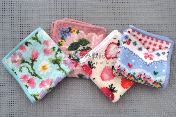 ※2025年現在も買い続けていますが、約10年前ほどの熱量はなく、また、コロナ禍と私の加齢を経て外出の回数が減り、ハンカチの使用頻度も落ちています。今は好みにドンピシャのものに絞りつつ購入しています。基本的に、ピンクやパステルカラー中心、動物少なめ、靴の柄は少し考え、虫入りはナシのスタンス。ゲストタオルの便利さに目覚めたのと、ポーチ類をほとんど買わなくなったのも変化です。