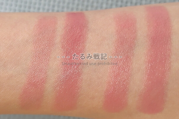 左から、04スモーキーピンク、05フレッシュネクター、08カンパリオレンジ、09シュリンプベージュです。04と05、08と09に分けて買ったので、色比較画像や感想は次からの項目で詳しく述べていきます。