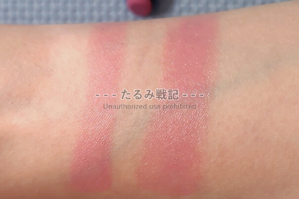 左がリップティントNの118ブルームピンク、右がシアーマットリップスティック101スパイシーピンクです。どちらも限定カラー。